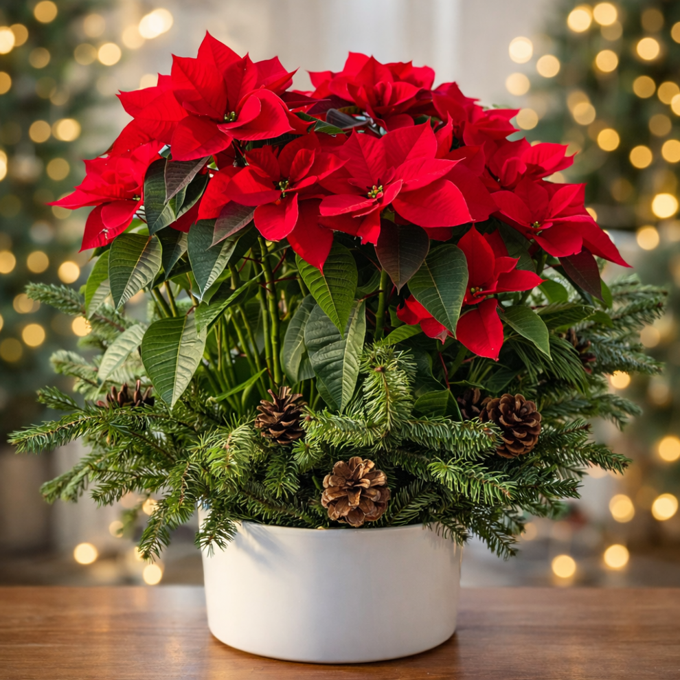 Yılbaşının vazgeçilmez simgesi Yılbaşı Yıldızı (Atatürk Çiçeği), çam dalları ve kozalak detaylarıyla Nora Flowers’ın özel tasarımı olarak hazırlandı.